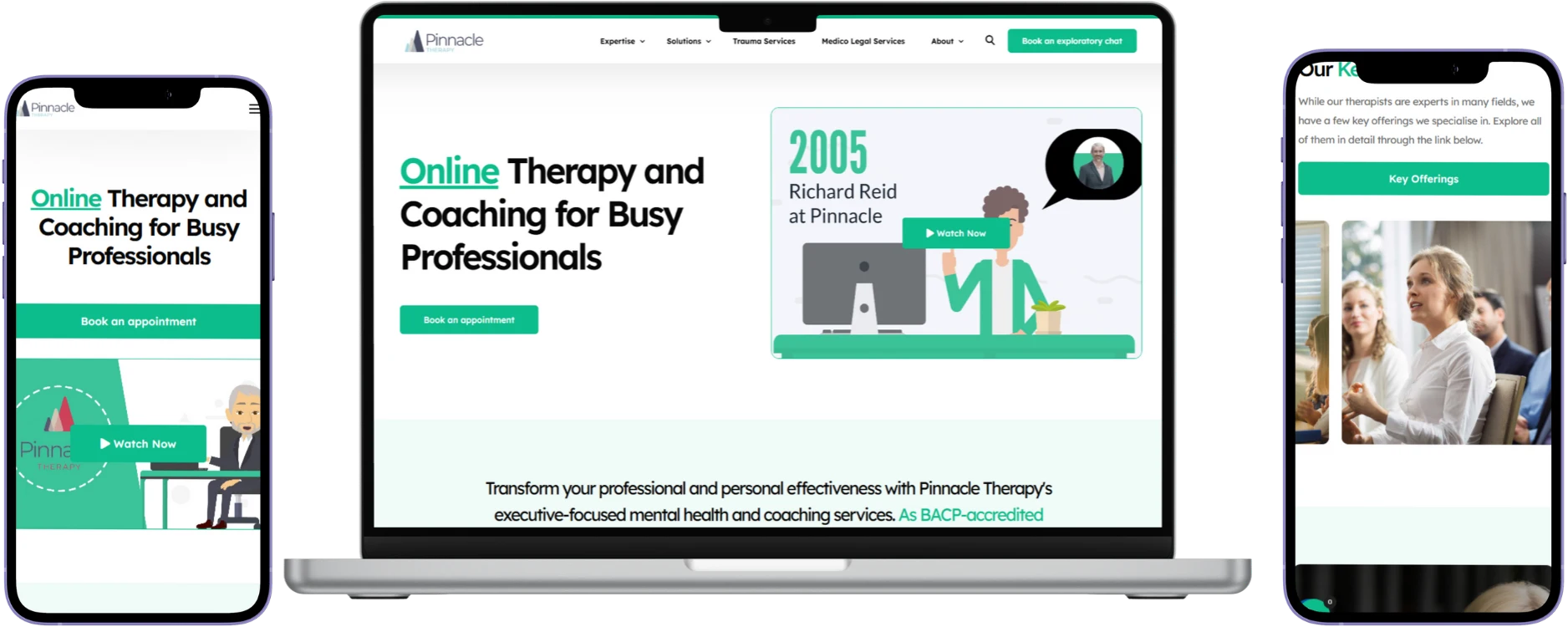Pinnacle Therapy sought to revitalize their online presence to better reflect their expertise and the breadth of services offered. The existing website lacked a cohesive design and did not effectively communicate their comprehensive offerings, such as family therapy, EMDR, and corporate training programs. Additionally, the site needed to appeal to a diverse clientele, ranging from individuals seeking personal therapy to organizations in need of corporate wellbeing solutions. The challenge was to create a platform that was both professional and approachable, accurately representing Pinnacle Therapy’s brand identity.